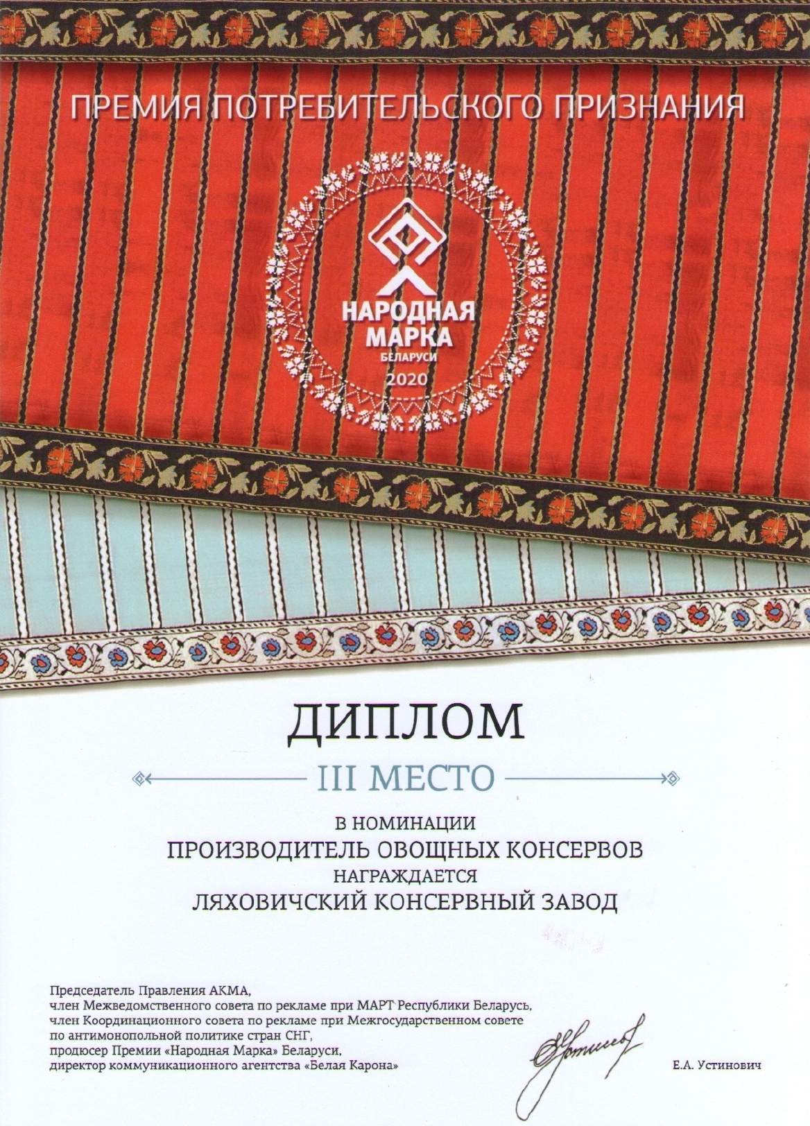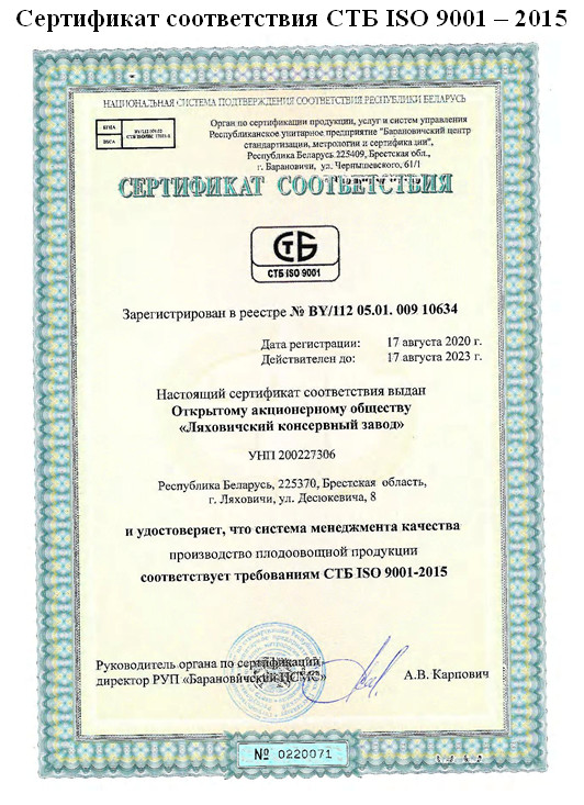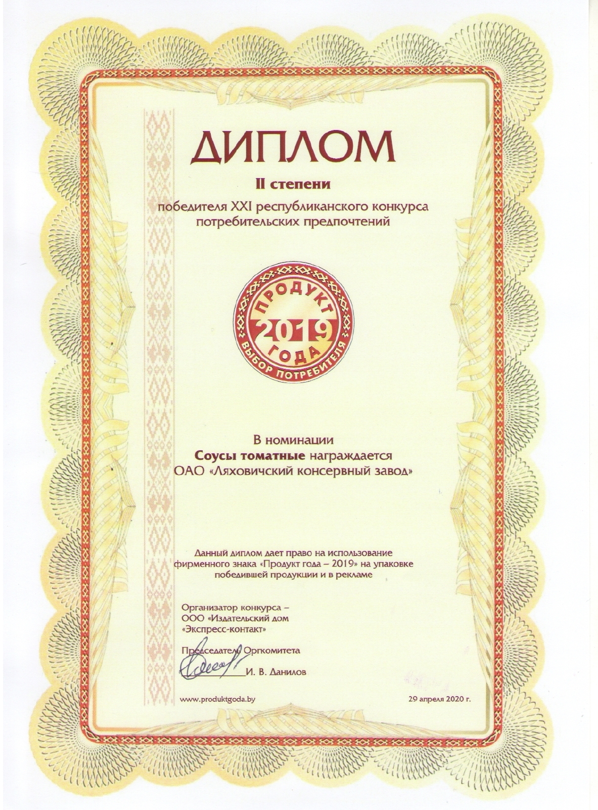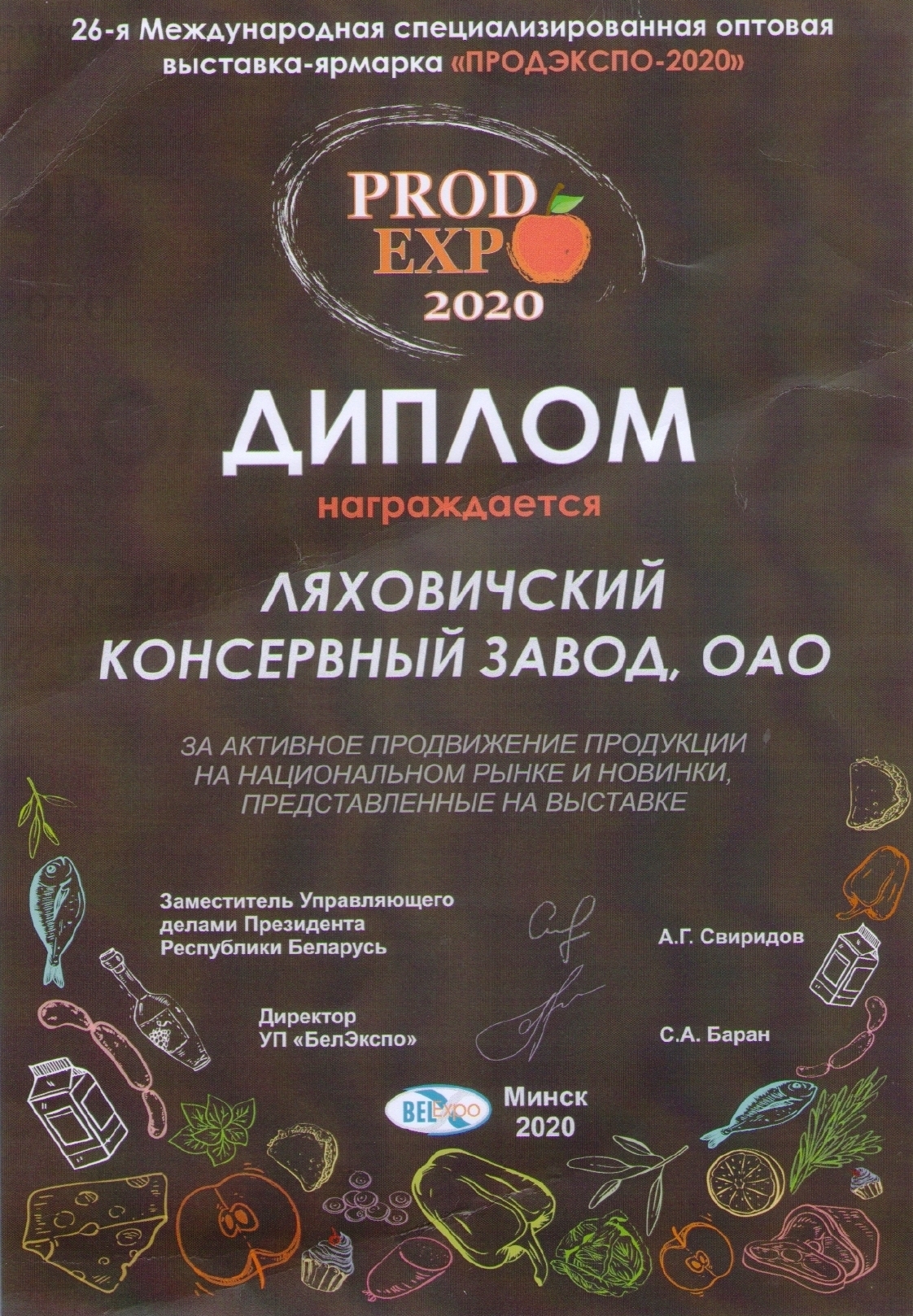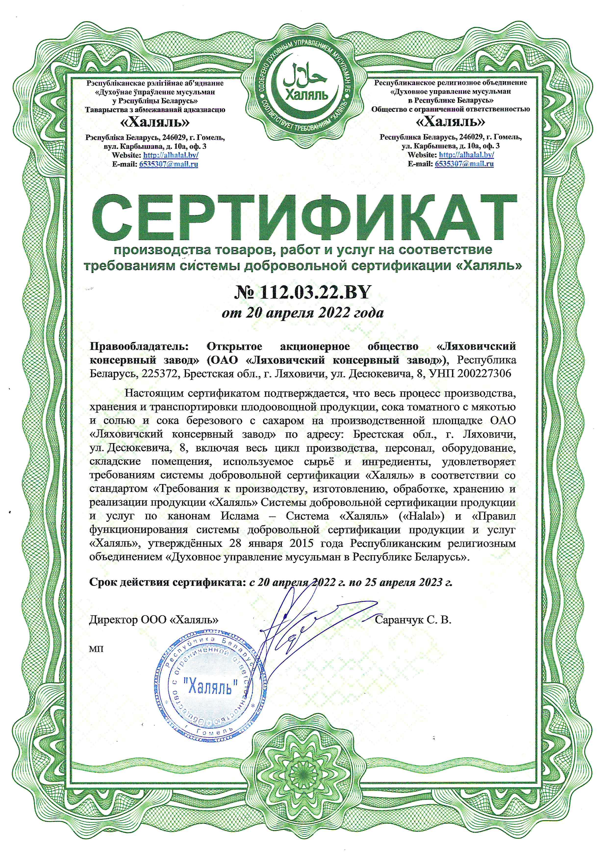 Завод производит около 150 наименований овощных, томатных и фруктовых консервов в разной расфасовке в количестве около 20 миллионов условных банок консервов в год. Ляховичские соки, нектары, повидло, овощные закуски, обеденные консервы, томатные соусы реализуются в торговых организациях Беларуси и за ее пределами.